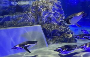 すみだ水族館に入ってまず驚くのが、生き物との距離の近さです。 特にペンギンのプールは、ガラスの壁がない(低い)場所があって、すぐ目の前で泳ぐ姿が見られます。